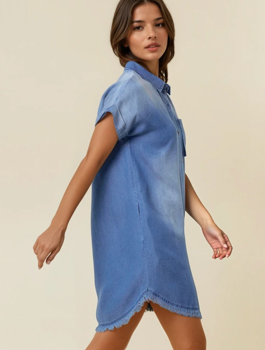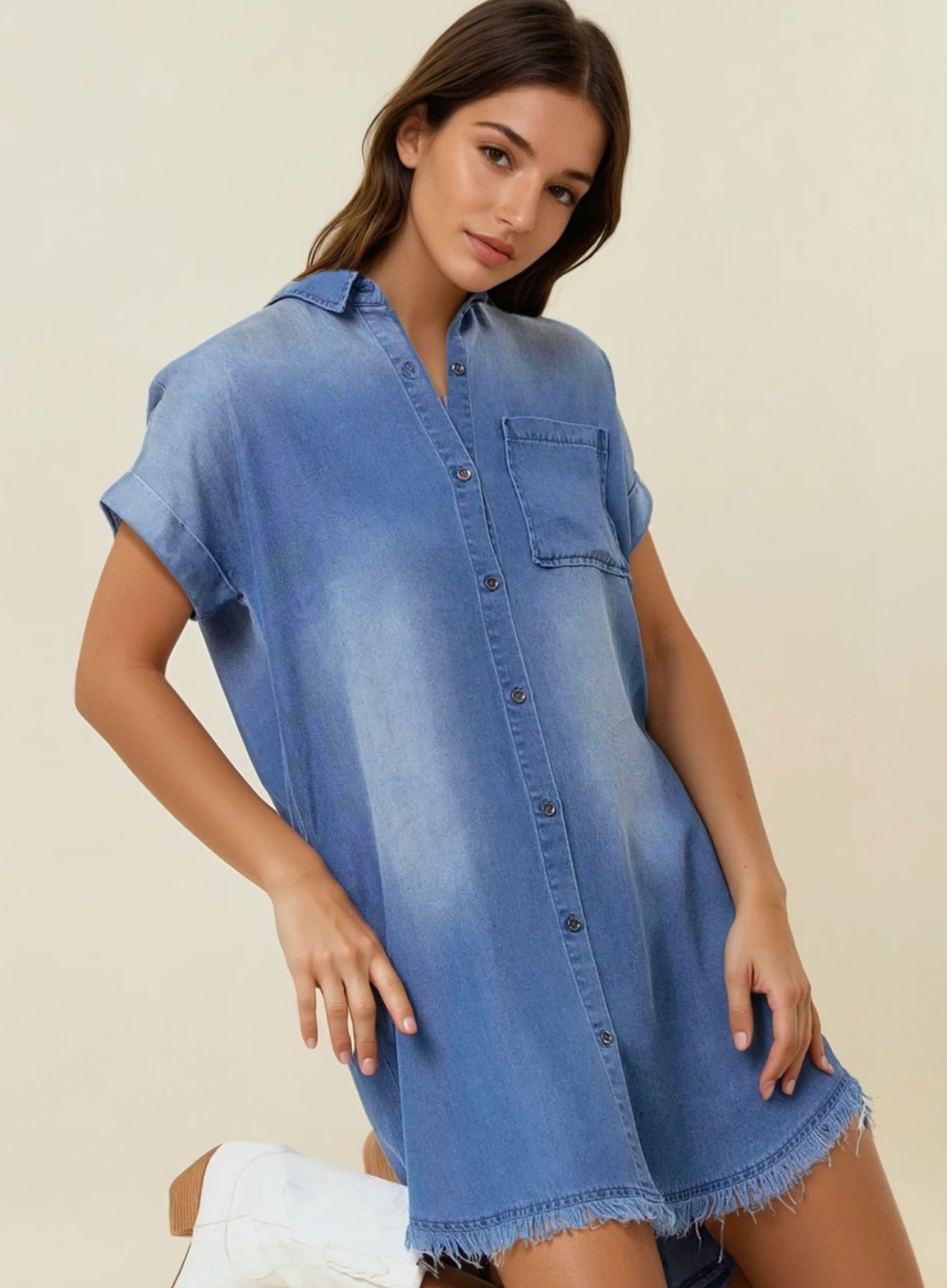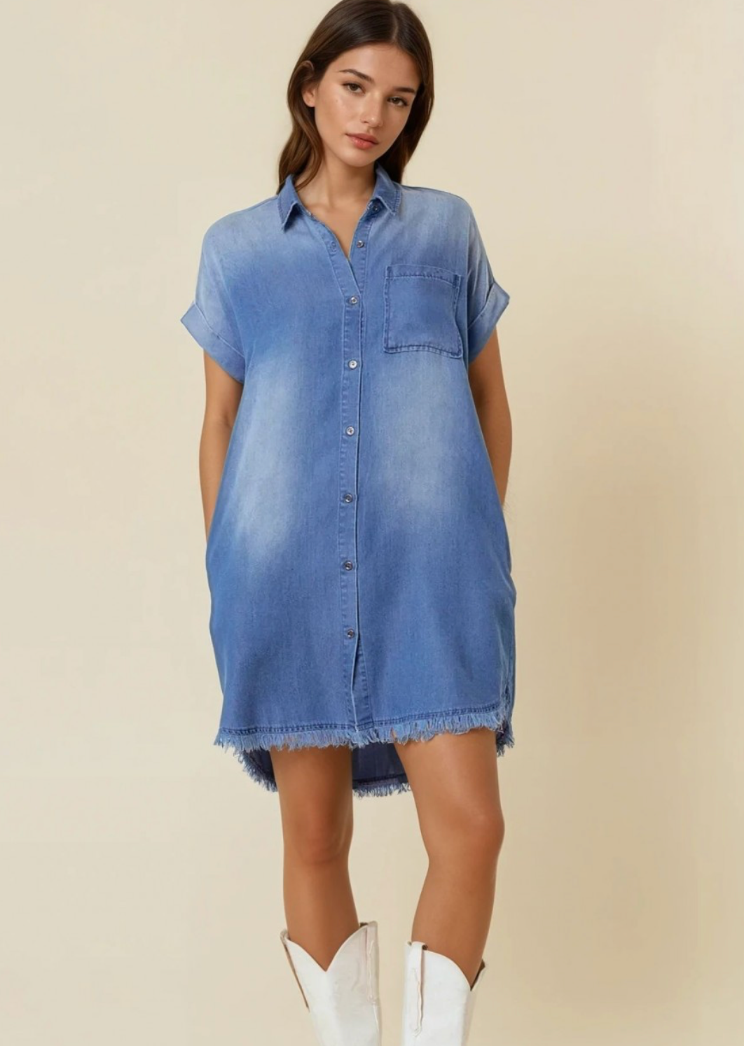 DOLMAN SHORT SLEEVE TENCEL DENIM SHIRT MINI DRESS W/ SIDE POCKET Fabric 100% TENCEL C.O.O Made in China DOLMAN SHORT SLEEVE TENCEL DENIM SHIRT MINI DRESS W/ SIDE POCKET