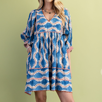 Printed V-Neck Mini Dress with Striped Binding and Ric-Rac Trim Details