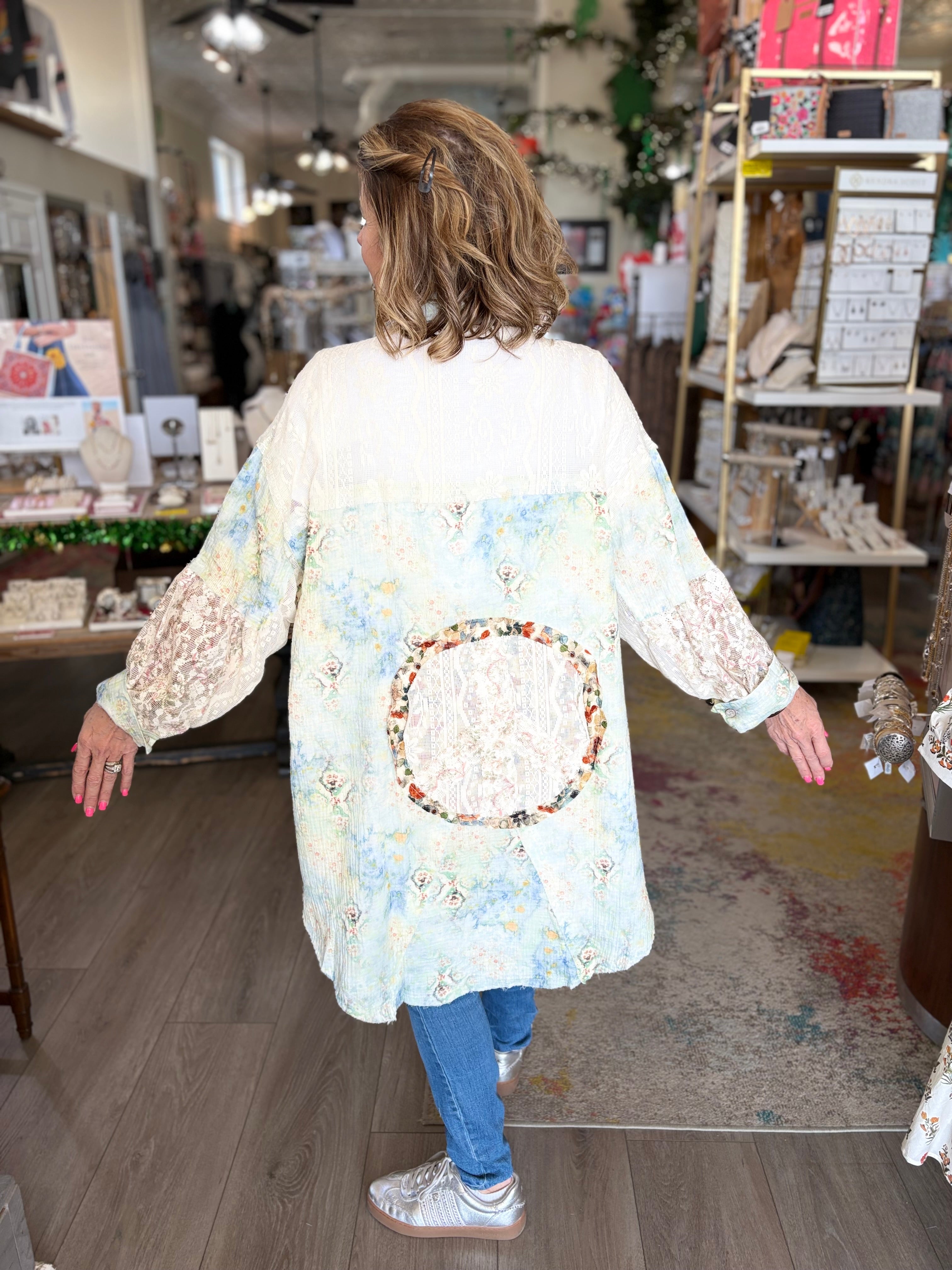 Designed in roomy fit long sleeve shirt top in double gauze with floral and embroidered print patch, front pocket, peace patch with outseam, vintage washing, floral pattern.