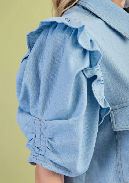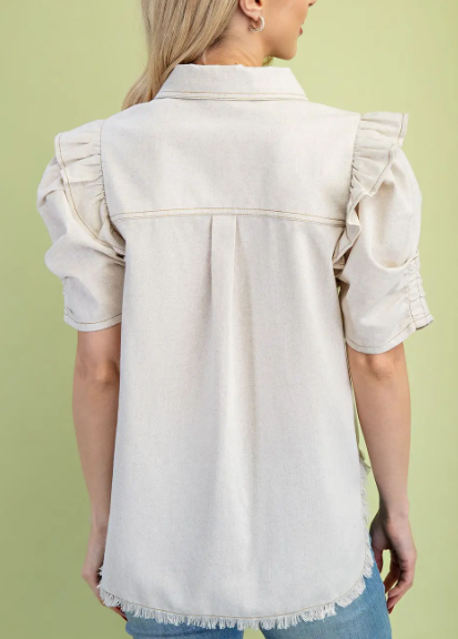 Linen Button Up Shirt with a Ruffled Gathered Sleeve and Frayed Hem Details