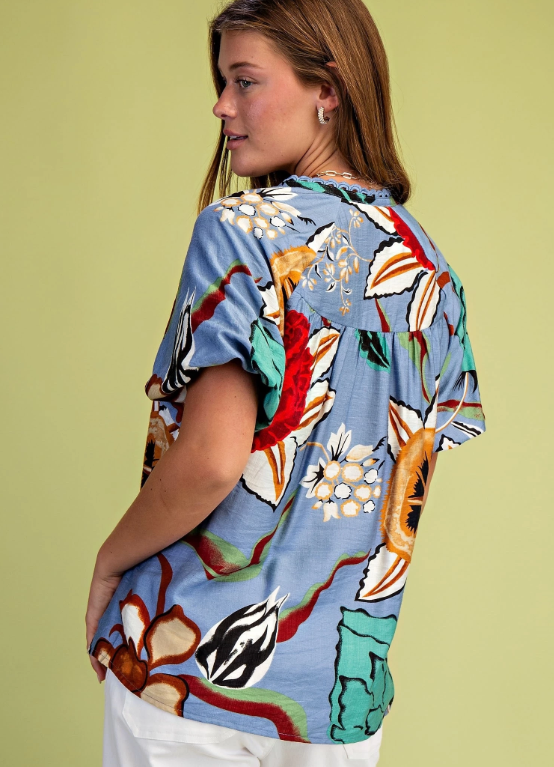 Floral V-Neck Top with Short Puff Sleeves and Decorative Trim Details