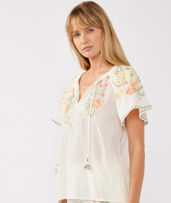 A resort lounge essential for those tranquil, sun-soaked days. Our top, paired perfectly & creates the ultimate duo for effortless comfort. Made from soft cotton gauze, this standout short sleeve top showcases contrast embroidered details and a charming split v-neckline with ties. Refresh your wardrobe and embrace those effortless boho vibes!