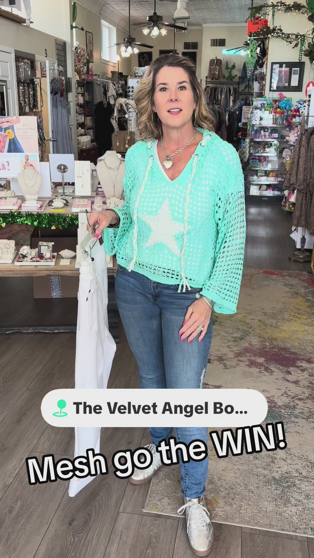 Woman wearing a light blue crochet top with a star design in a store setting.