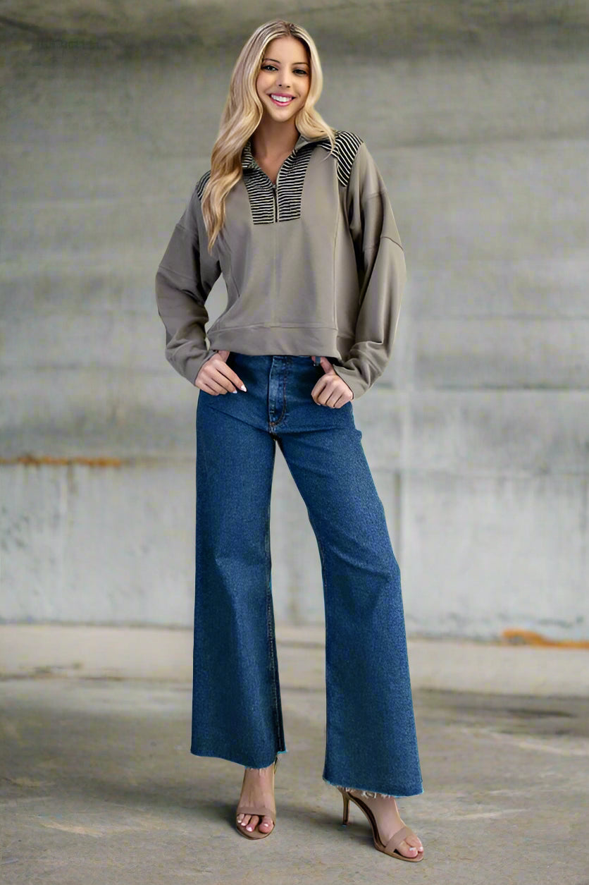 Texture Mixed Half Zip Sweatshirt with a Striped Ribbed Yoke and Mock Neck Model is 5'7" wearing a small.