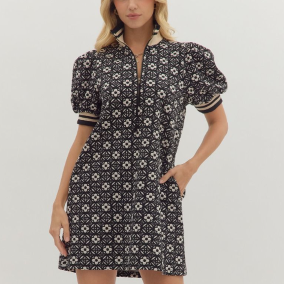Floral textured short puff sleeve mini dress featuring half zip closure at front. Ribbed collar and cuffs. Side pockets. Unlined. Knit. Non-sheer. Medium weight.