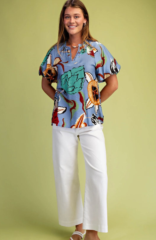 Floral V-Neck Top with Short Puff Sleeves and Decorative Trim Details