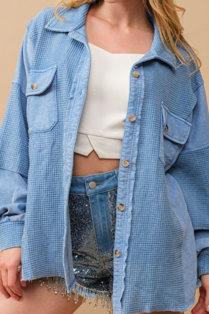Garment Washed French Terry Waffle Mix Button Up Knit Shirt Jacket