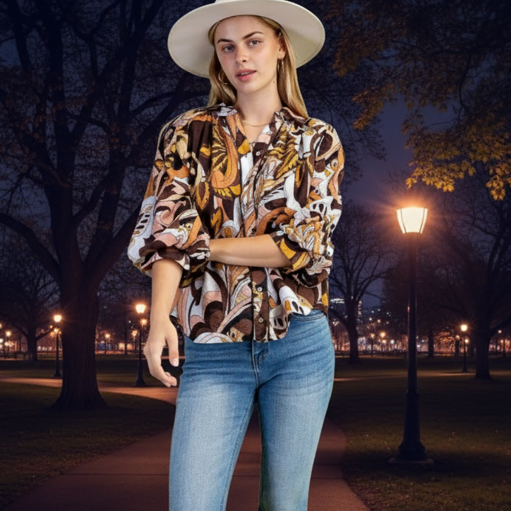 Printed Button Down Raglan Puff Sleeve Top. The Top is Lined Model is 5'8" wearing a small.