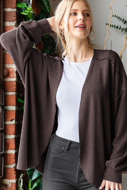 95% POLYESTER 5% SPANDEX LONG PUFF SLEEVE SOLID URBAN RIBBED OPEN CARDIGAN
