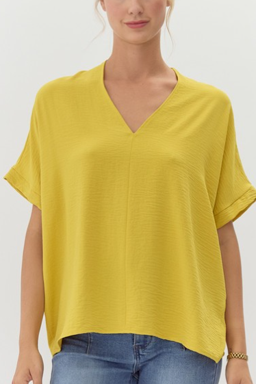 Solid boxy top with a V-neckline and short sleeves. - non-sheer, lightweight. - Models are wearing a Small. 7854