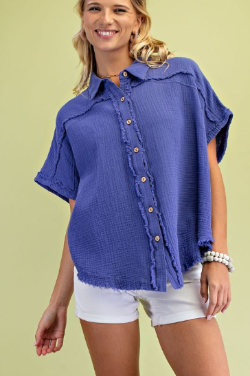 Gauze Button Down Top with Distressed Raw Edge Detail