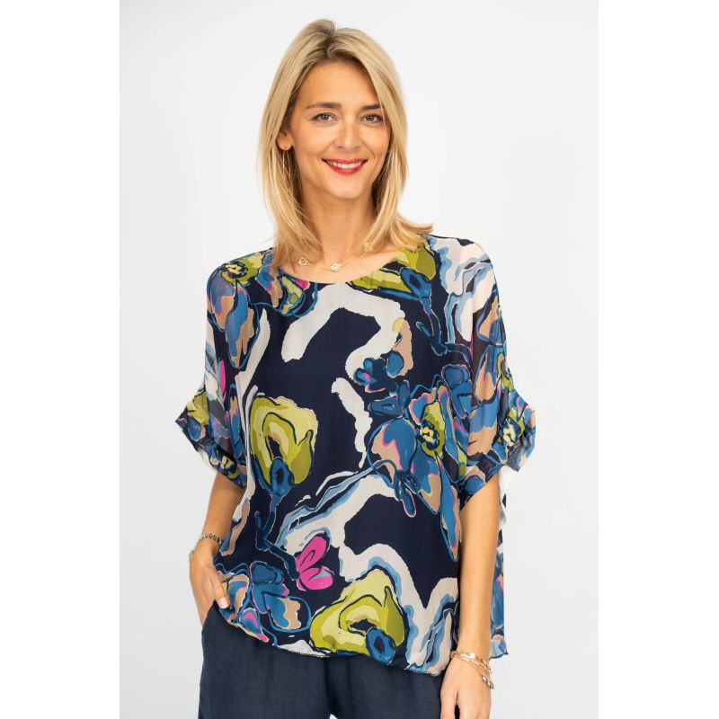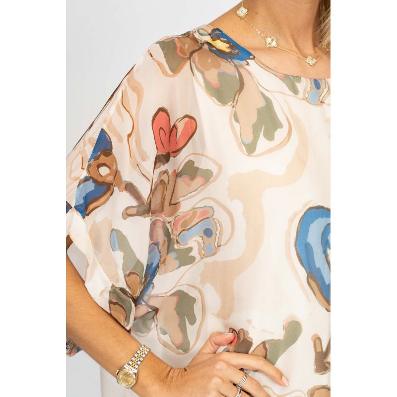 Flowers Printed Silk Blouse. Elbow length sleeves. Lined.