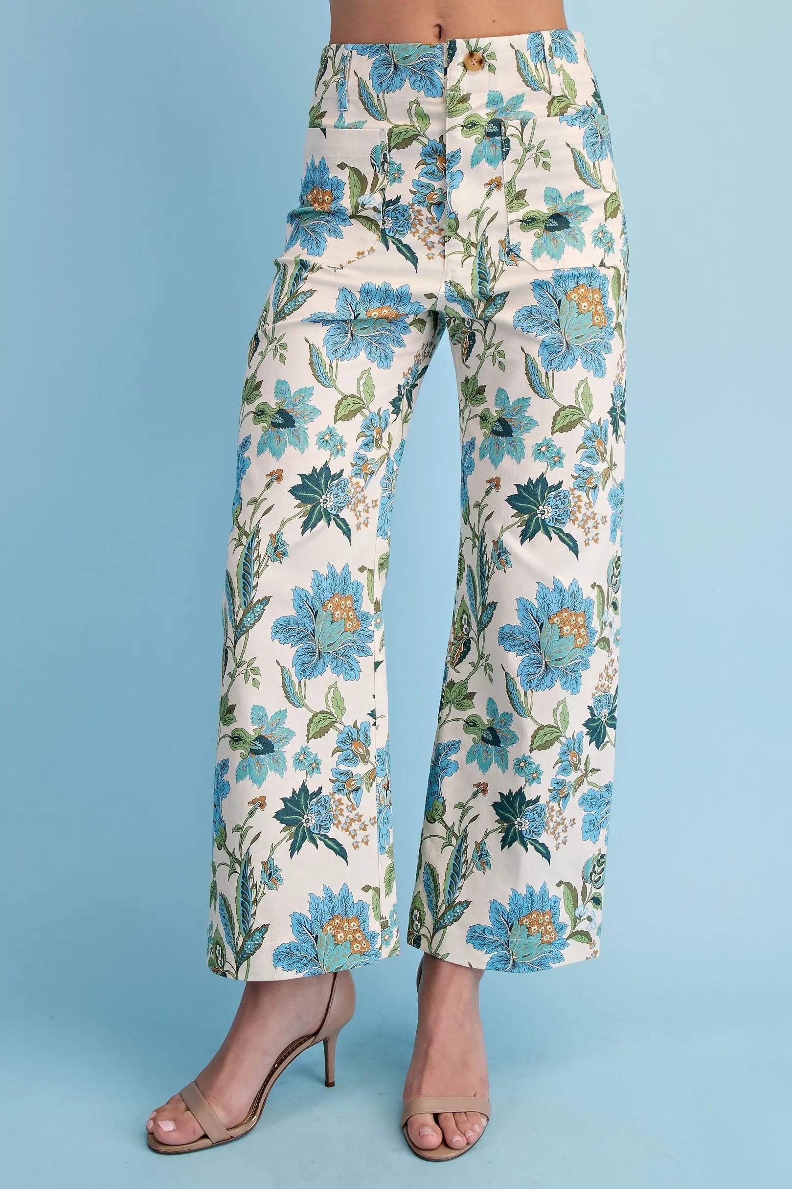 Floral Ankle Cropped Pants in a Stretchy Denim-Like Fabric with Pockets