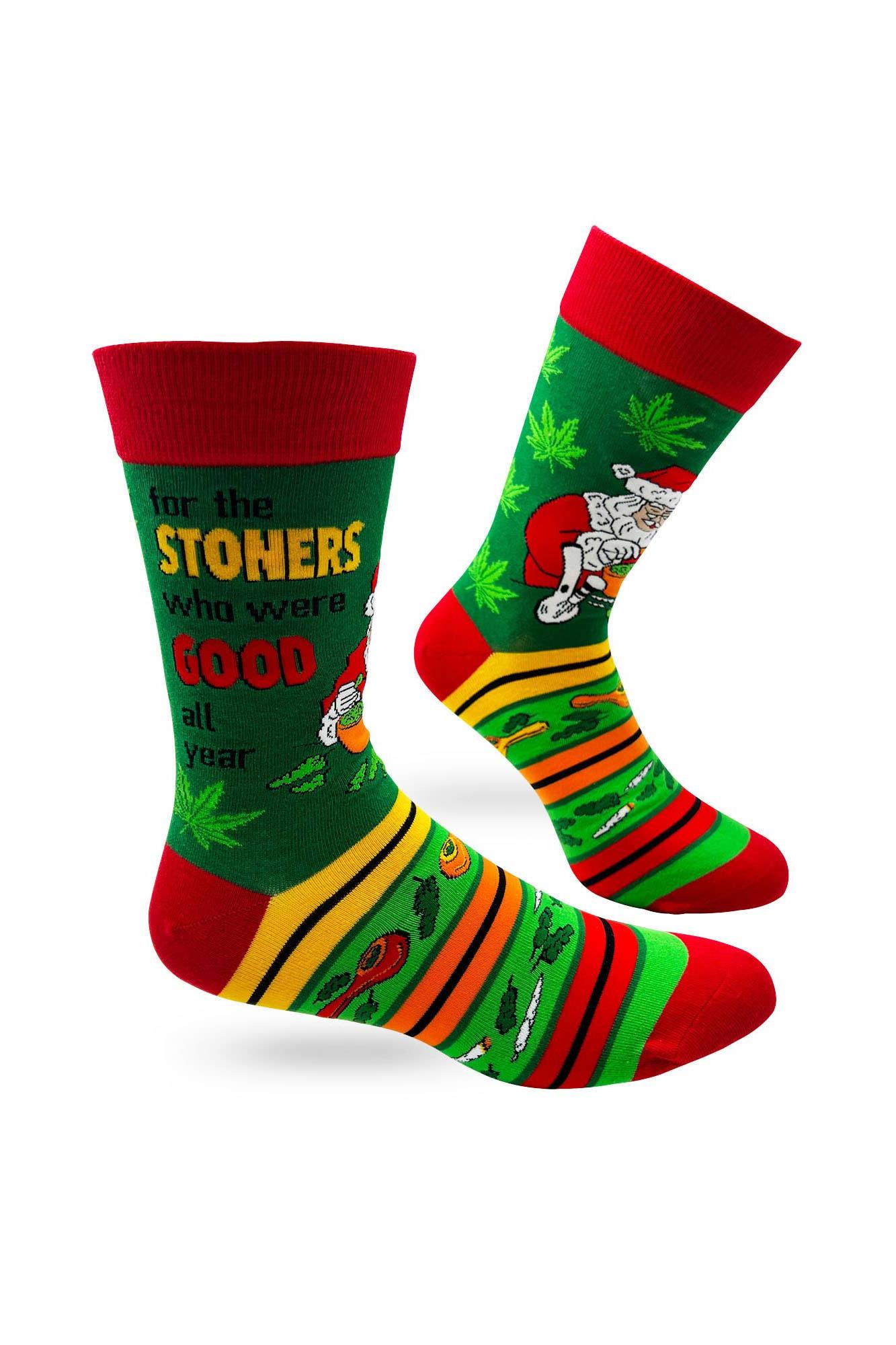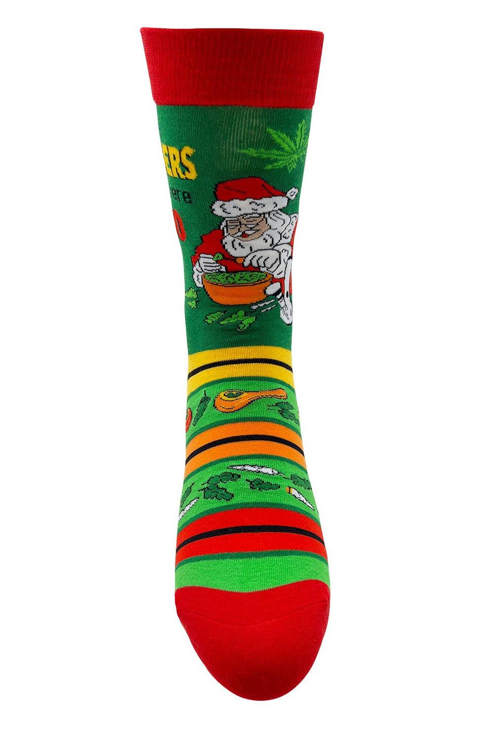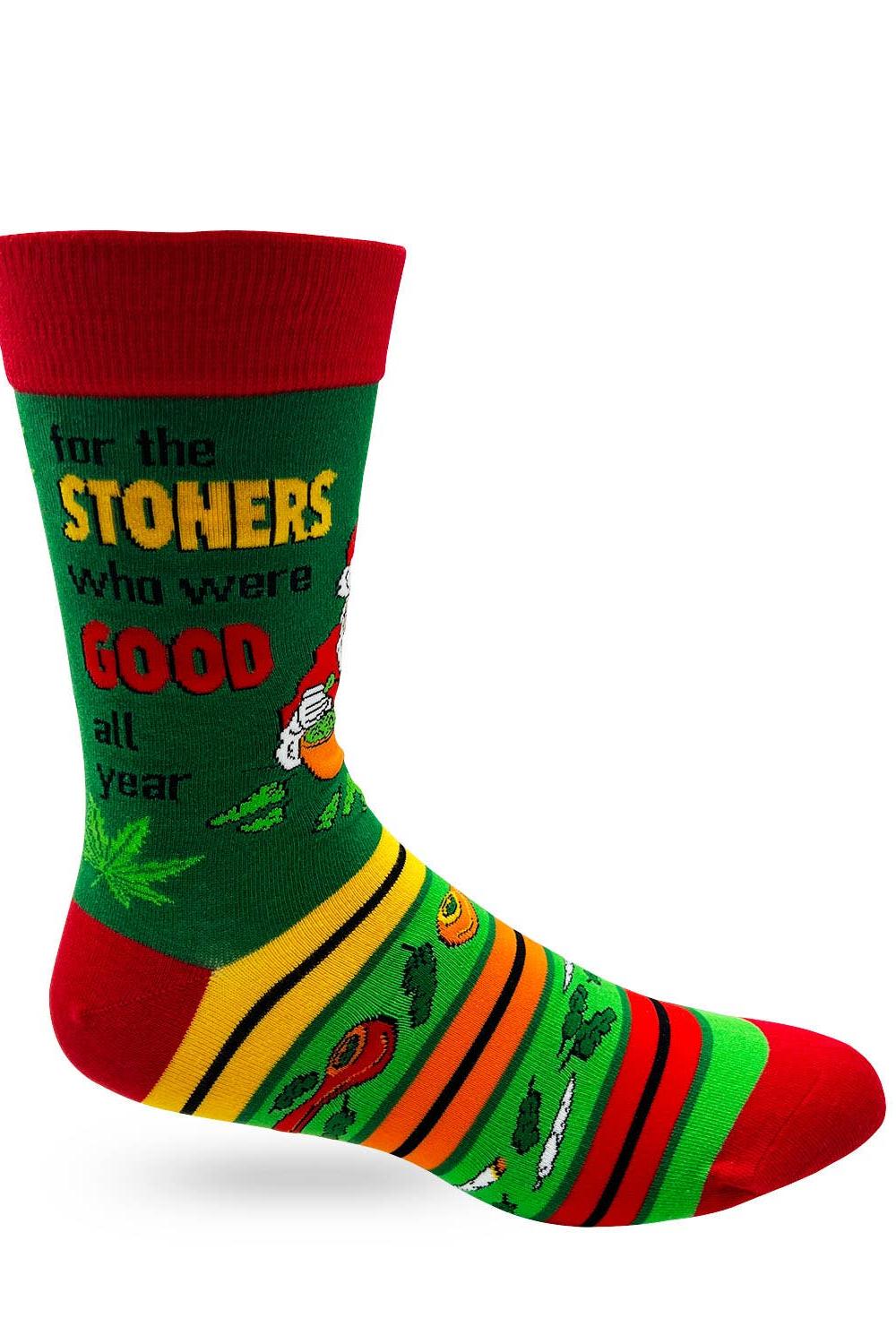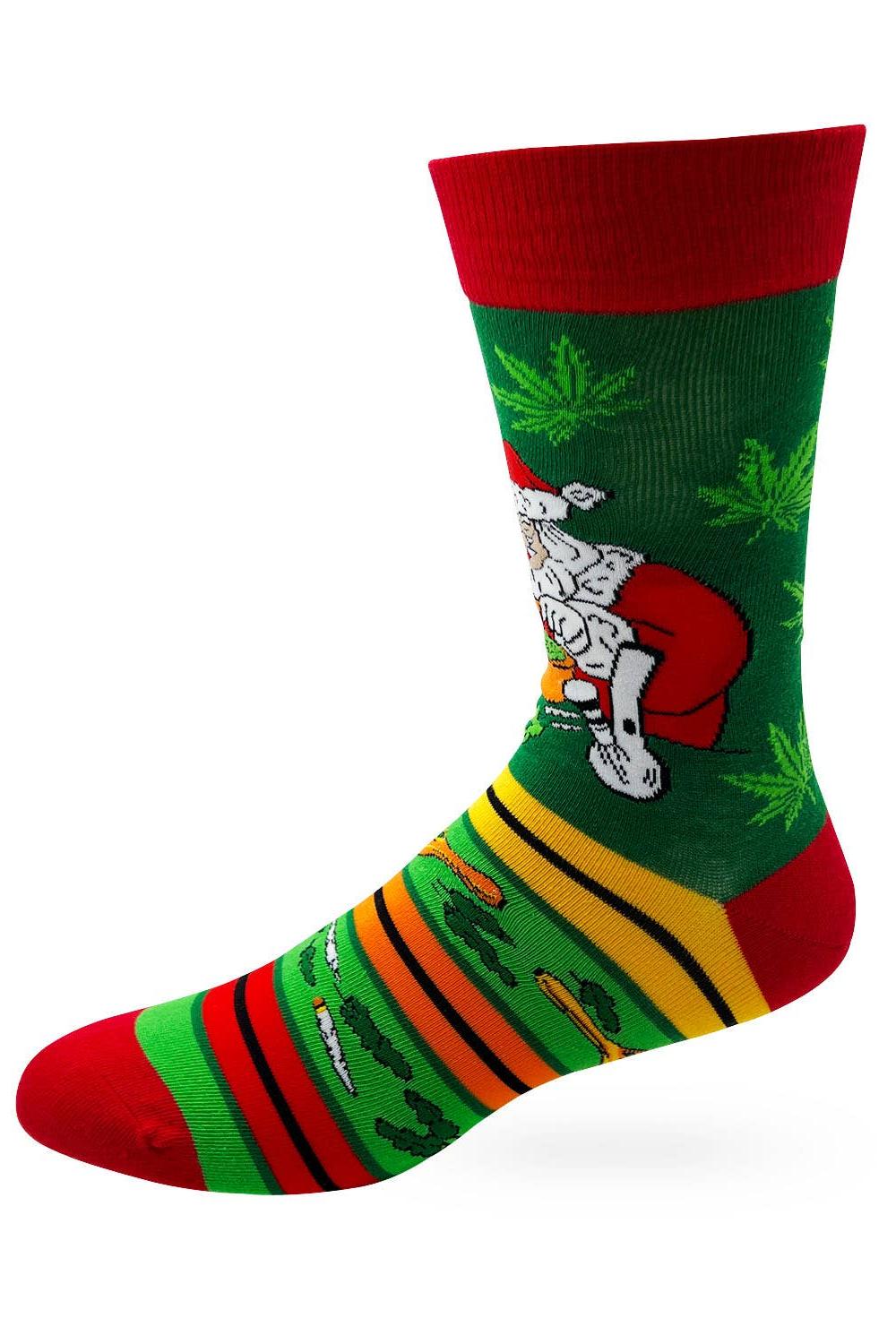 Men's Christmas novelty crew socks feature marijuana leaves, Santa Claus, and saying "For the Stoners Who Were Good All Year".