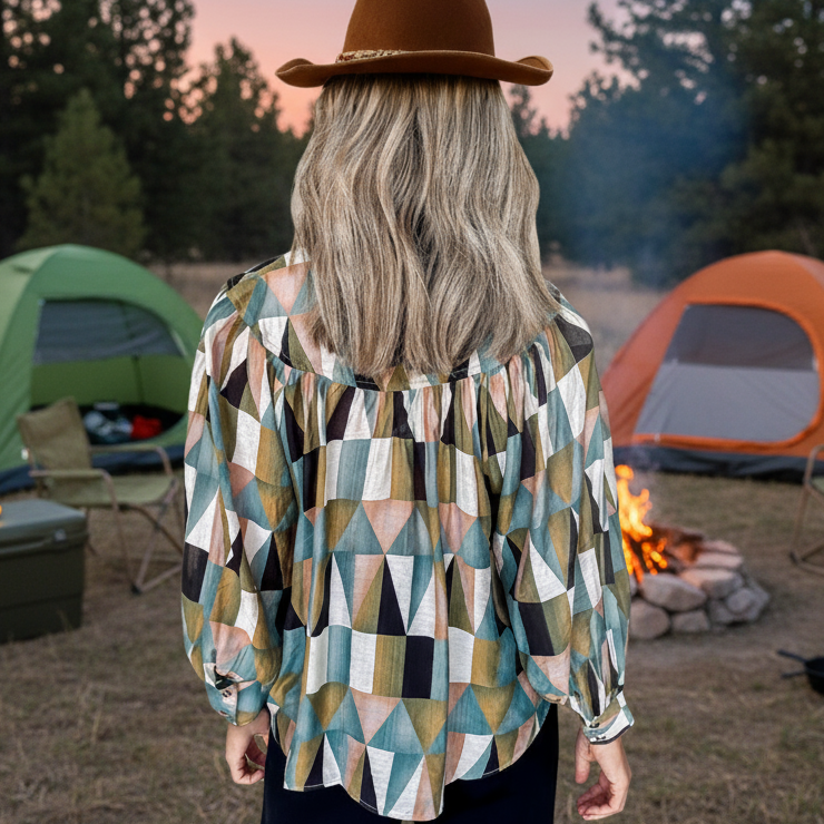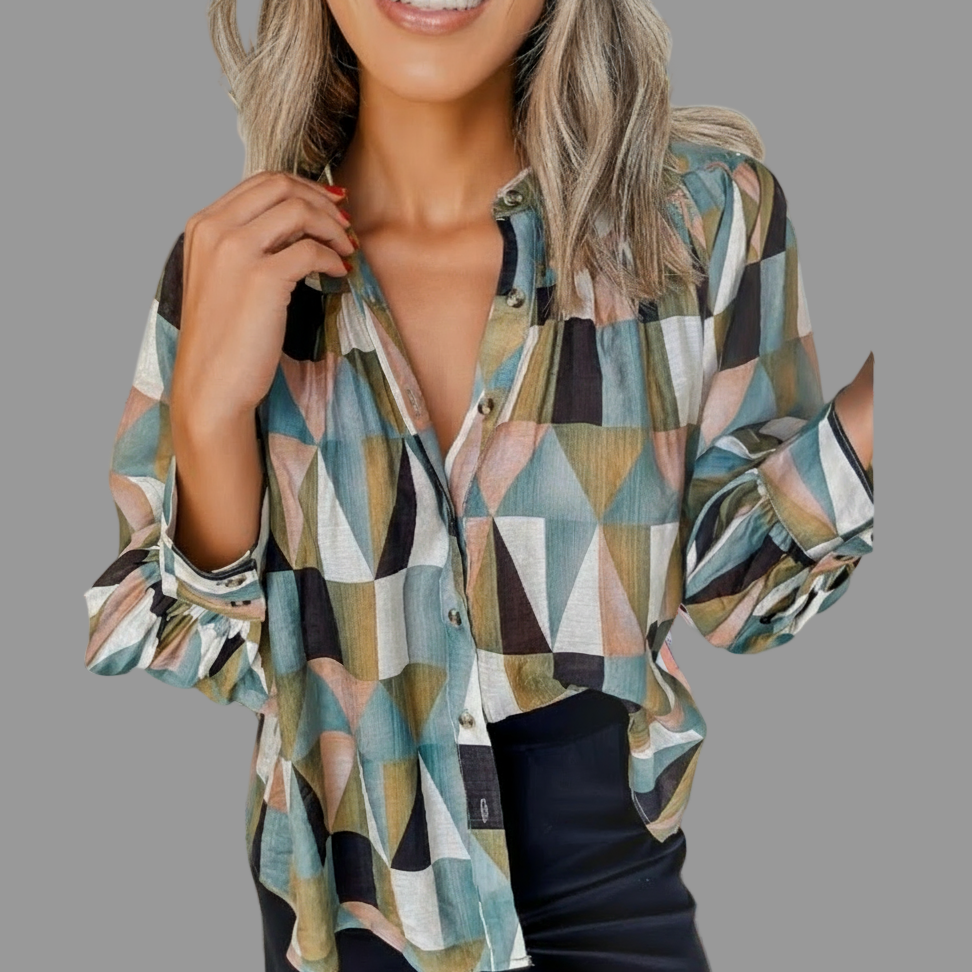 🌺Material: 81%Viscose+19%Polyamide 🌺Pattern: Geometric 🌺Neckline: Shirtcolla 🌺Sleeve: Long Sleeve 🌺Details: Button The unique geometric print adds a stylish flair to this women shirt It features a buttoned front offering a practical and convenient design. The balloon sleeves provide a voluminous and fashionable silhouette. The loose fit ensures comfort and ease of movement.