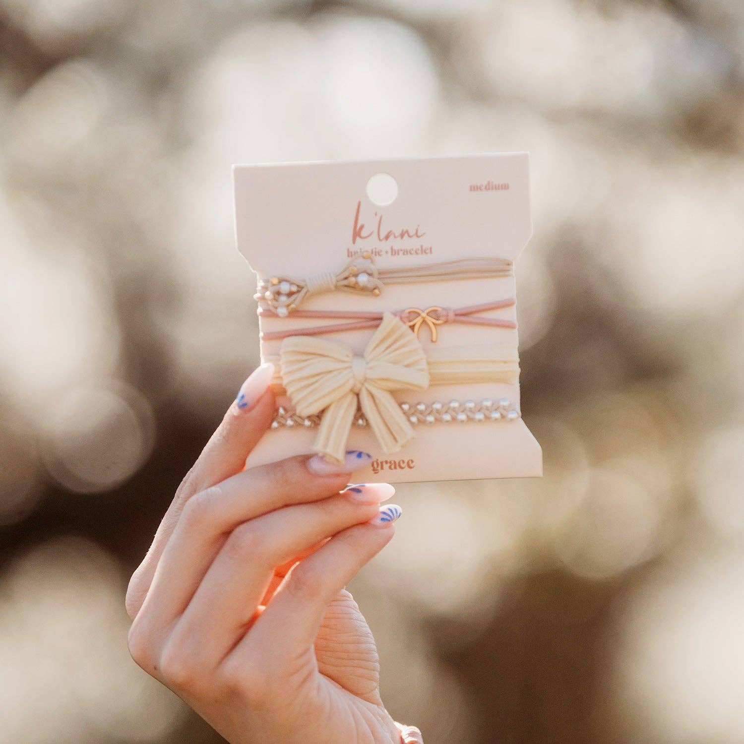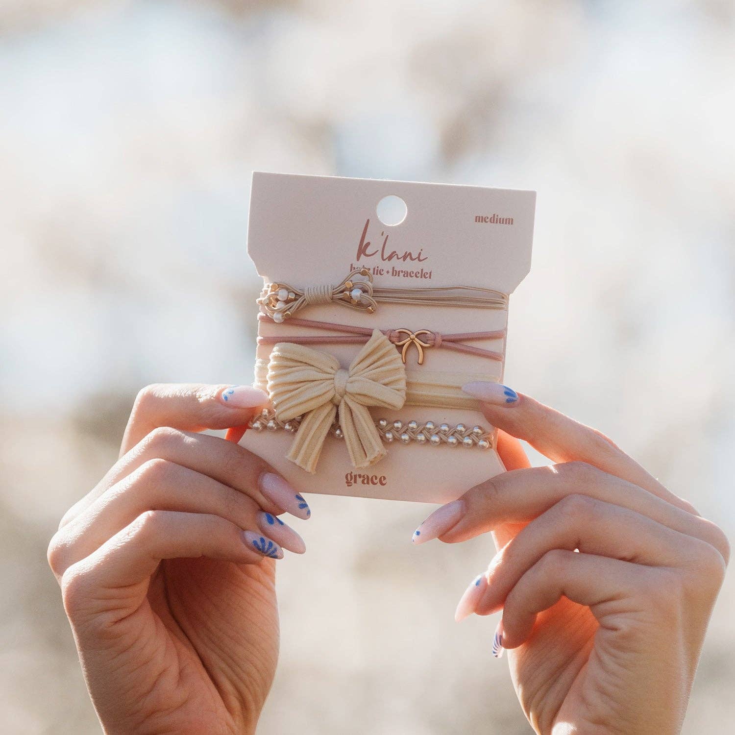 Our Grace set of hair tie bracelets brings trendy femininity with its fusion of pearls, gold accents, and dainty bows. Each bracelet is perfect for adorning wrists and embellishing your hair. We all deserve a touch of grace now and then.