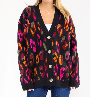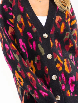 Soft acrylic-polyester blend, button closure front, versatile animal print design, ideal for layering, perfect for transitional seasons, flattering fit, popular with contemporary boutiques.