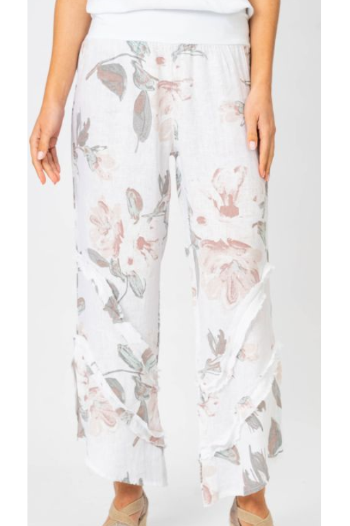 Linen pants, elastic waistband, ruffle detail on bottom.