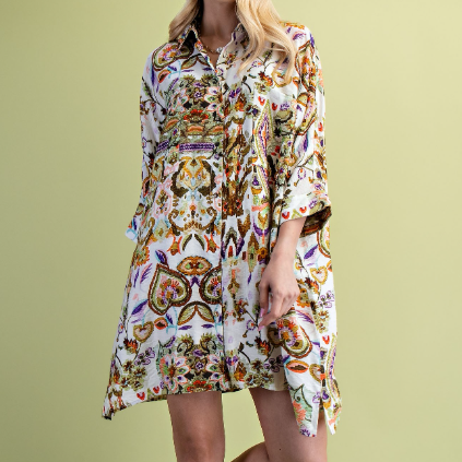 Watercolor Print Button Down Shirt Dress Model is 5'7" wearing a small.