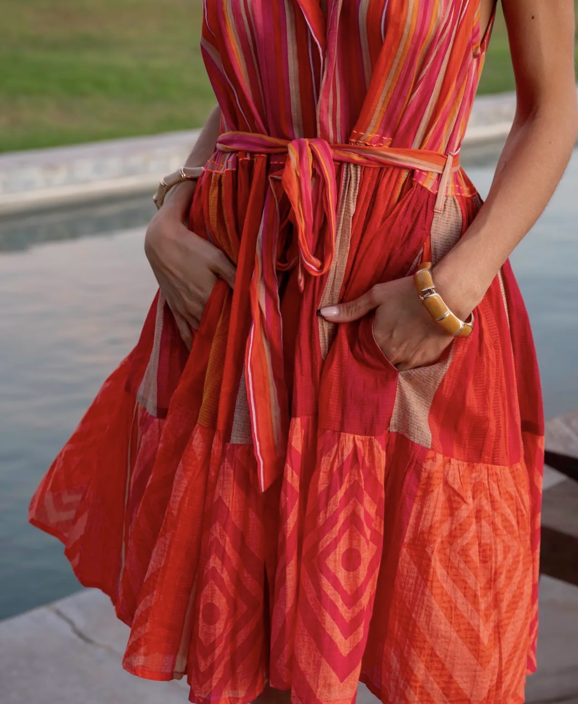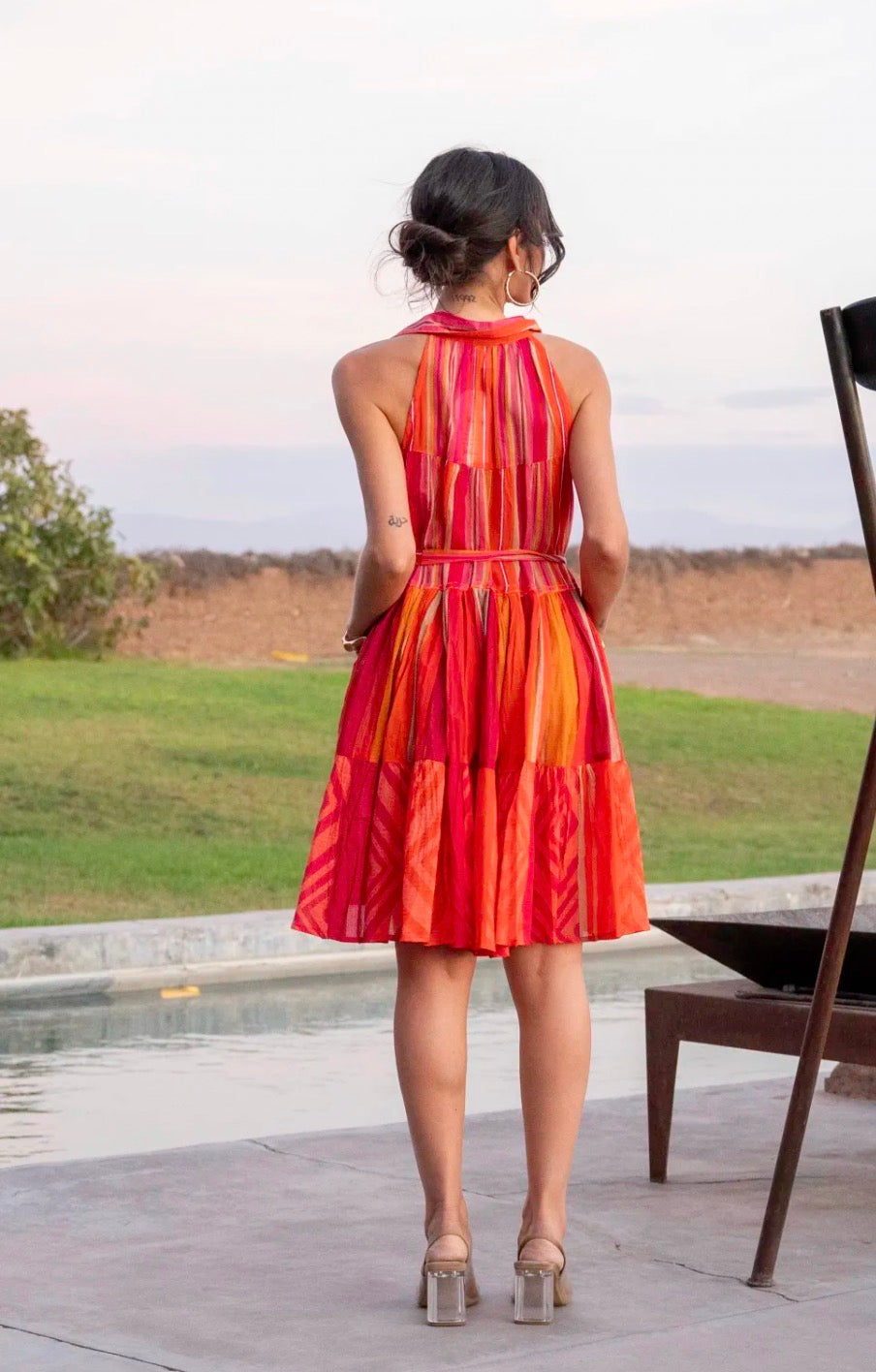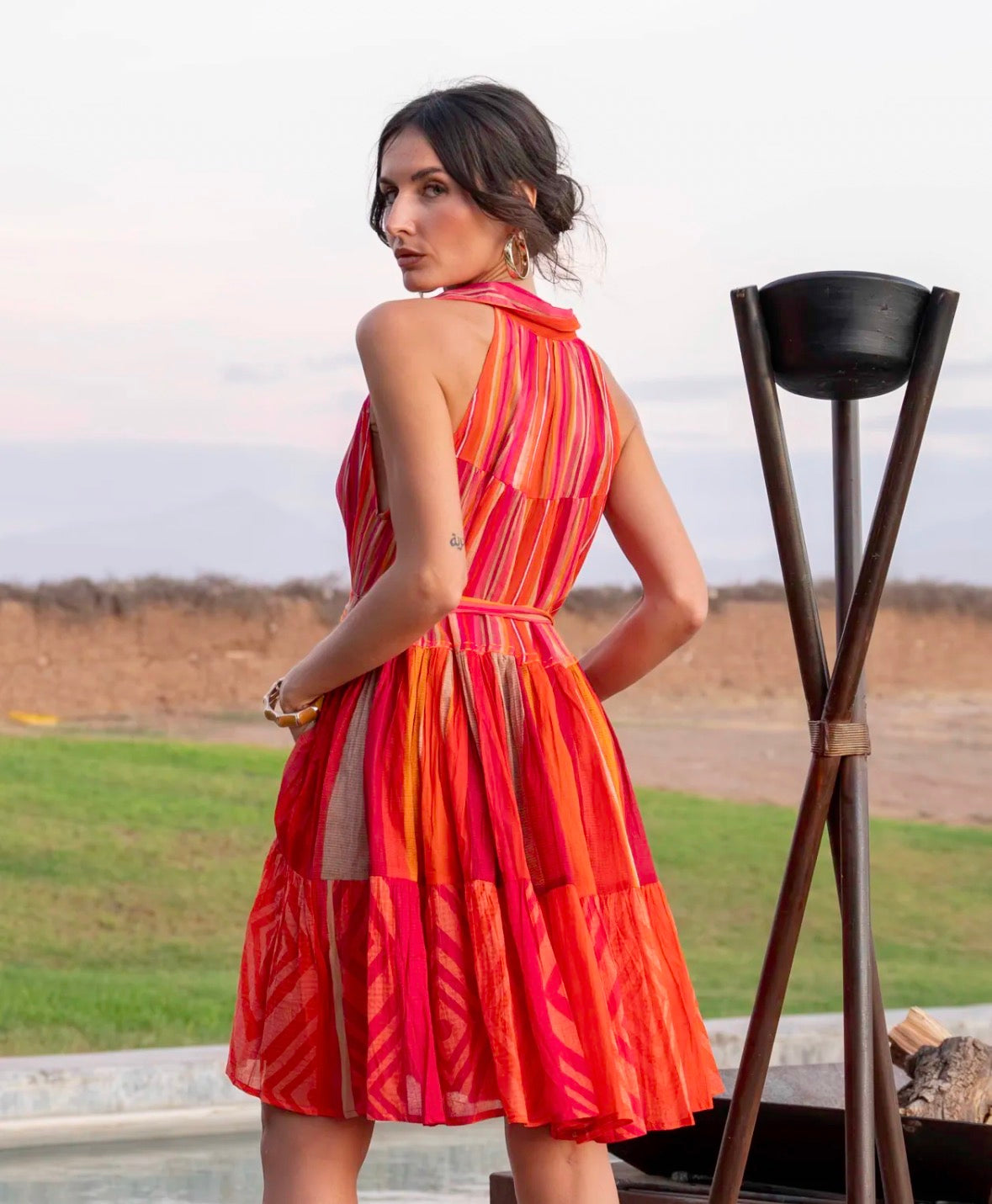 Robe courte à imprimé multicolore, conçue dans une matière légère et fluide. Elle présente un décolleté en V, un col chemise, et une ceinture à nouer à la taille permettant d’ajuster la silhouette.