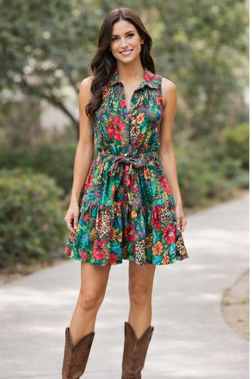Robe courte à imprimé multicolore, conçue dans une matière légère et fluide. Elle présente un décolleté en V, un col chemise, et une ceinture à nouer à la taille permettant d’ajuster la silhouette.