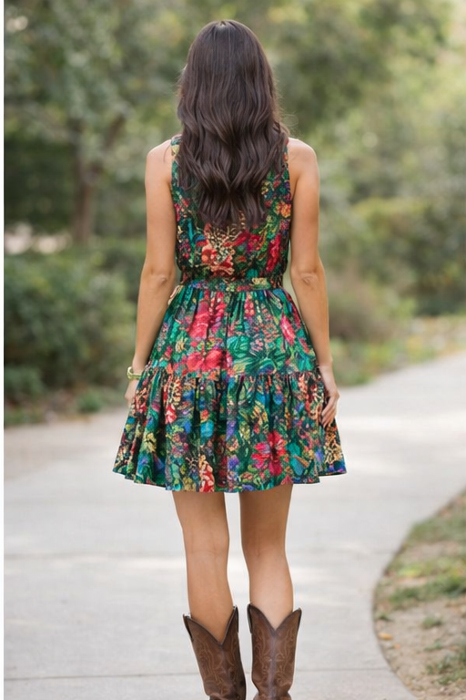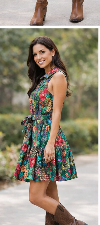 La jupe à volants apporte du volume et du mouvement, tandis que la coupe sans manches la rend idéale pour la saison estivale. Un modèle facile à porter au quotidien ou en vacances.