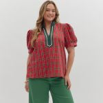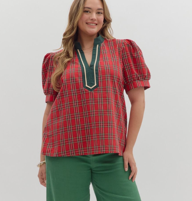 Plaid pattern cuff band short sleeve top featuring contrast accent caftan-inspired V-neck band. Unlined. Woven. Non-sheer. Lightweight.