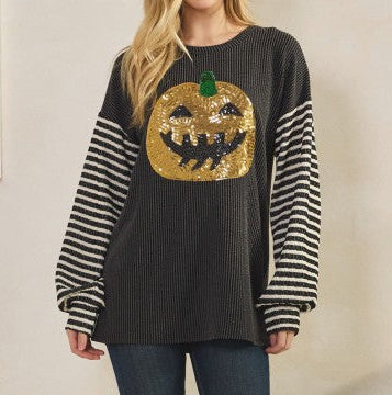 ***HALLOWEEN, PUMPKIN*** 95% POLYESTER 5% SPANDEX LONG SLEEVE ROUND NECK SOLID URBAN RIB AND JACQUARD STRIPE