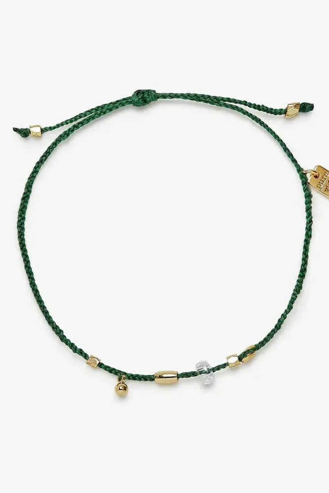 An effortless added touch that instantly elevates the rest of your bracelet canvas, this string piece is available in a stunning heather green with understated gold and stone accents throughout.