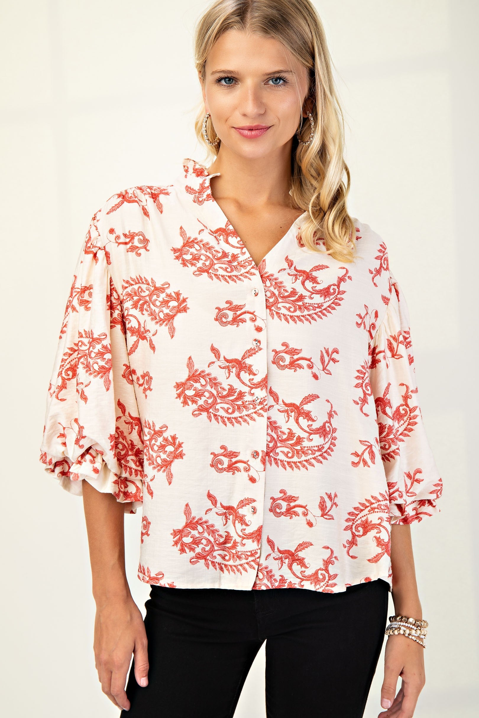 Button Down Blouse with 3/4 Length Balloon Sleeves Model is 5'9" wearing a small.