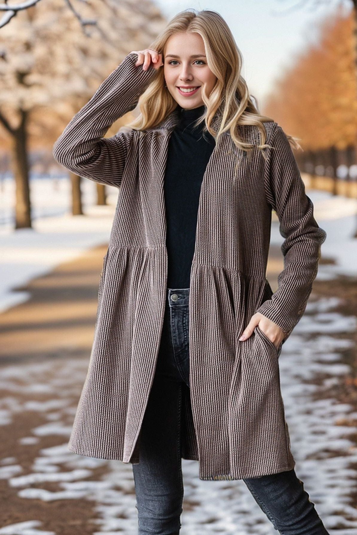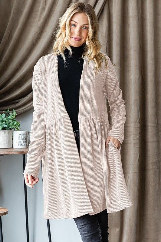 95% POLYESTER 5% SPANDEX LONG SLEEVE SOLID URBAN RIBBED RUFFLED OPEN CARDIGAN WITH SIDE POCKET DETAIL *The garment color may differ slightly upon arrival due to being taken with professional lighting also depending on what device you maybe using to shop*