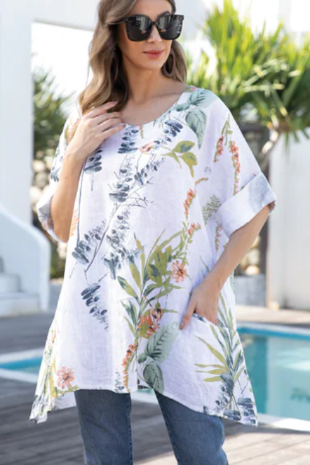 Embrace effortless elegance with Stefania's Eucalyptus Printed Top, designed to offer both style and comfort. Crafted from luxurious 100% linen, this top features a stunning eucalyptus print, adding a touch of nature-inspired beauty to your wardrobe. The A-line cut and slight flare create a flattering silhouette, perfect for all body types, while the tunic length provides added coverage for a confident look. With the addition of functional pockets, this top combines practicality and sophistication, making it a versatile choice for everyday wear or special occasions.