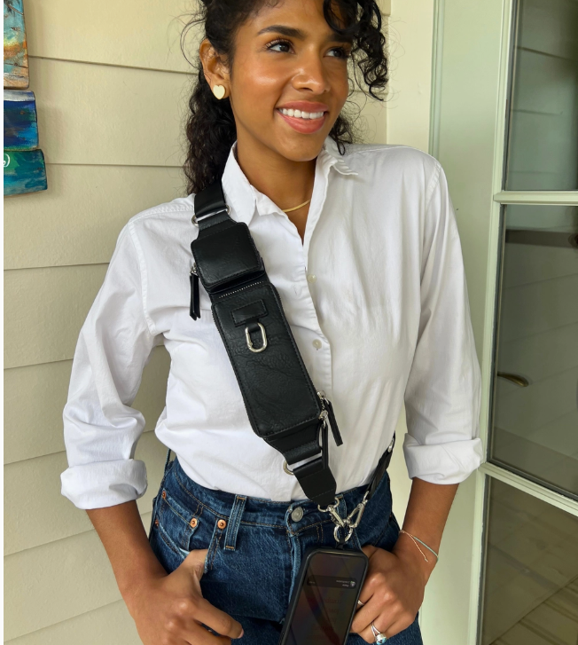 This attractive, extremely comfortable, crossbody strap offers more than meets the eye! The multifunctional design allows your phone to hang at your side hands free, while providing a secure and convenient place to carry your everyday essentials. Features Beautiful and extremely comfortable, adjustable crossbody shoulder strap. Upper small zippered front pocket, perfect for change, ear pods, or other items. Large zippered front pocket, with three credit card slots, one license window slot, and a roomy interior pocket with gathered elastic top for ease of use. Easily store your keys and other small essentials. Compatible with almost every phone case, so you can enjoy convenience without compromising your favorite look. ✅ Android ✅ iOS ✅ Nearly All Smartphones & Cases Dimensions Adjustable Shoulder Strap: 40" to 61" long