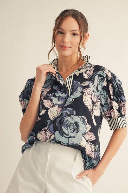 Short sleeves ruffled mock neck floral top, front button, stripe contrast accent. - Model is 5'10'' and is wearing a Small.