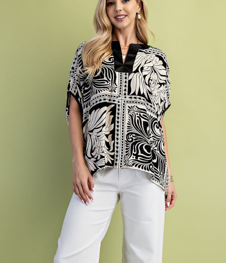 Marbled Bandanna Print Dolman Sleeve Top with a Satin Trim *Complete the Set - Matching Pants : TE1228 Model is 5'7" wearing a small.