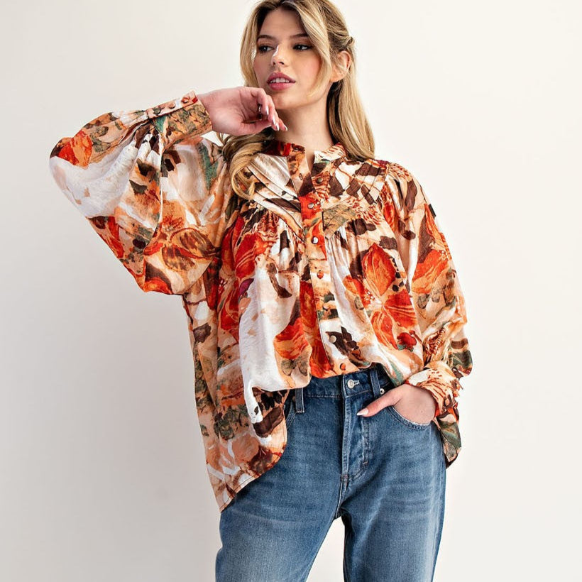 This long sleeve blouse features a rounded neckline with a button up front, a gathered yoke with stitched V-panel accents, allover abstract floral print, and a relaxed silhouette with buttoned cuffs for a voluminous finish. Ocean Mist styled with PK9865 Pumpkin Spice styled with PH12506 Model is 5'8" and wearing a small.Fabric Contents