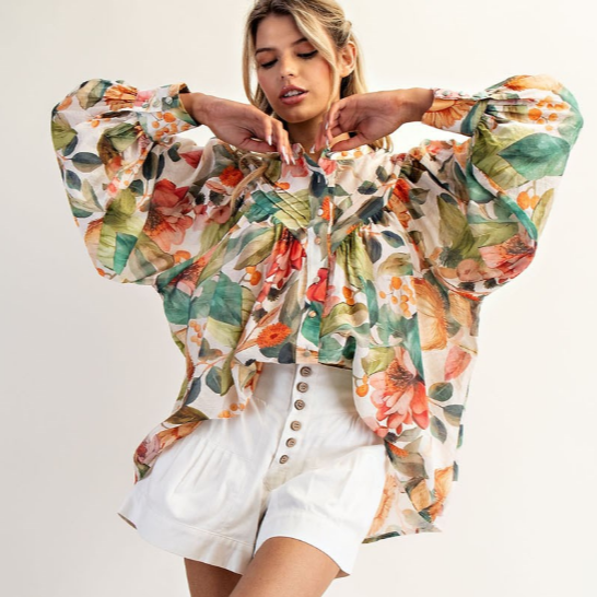 Floral Printed Button Down Shirt Top , FOREST BLOOM