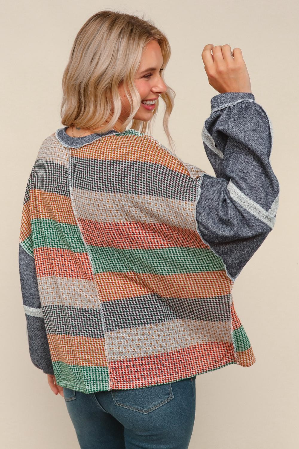 ROUND NECK MULTI COLOR STRIPE TEXTURED WAFFLE KNIT DENIM LOOP TERRY COLOR BLOCK WITH OUT SEAM OVERLOCK REVERSE STITCHES