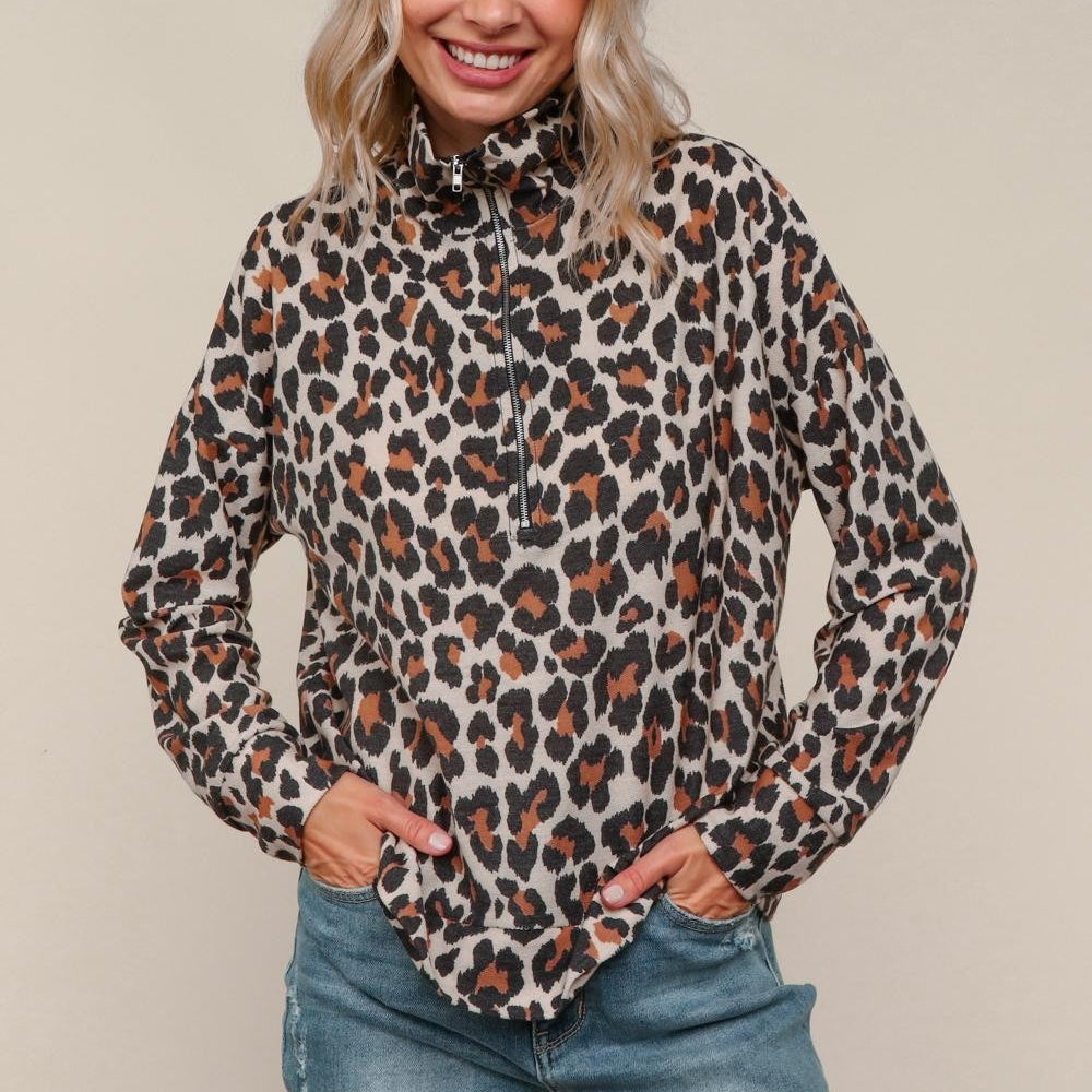 HIGH NECK HALF ZIP UP LONG SLEEVE FRENCH TERRY ANIMAL LEOPARD PRINT KNIT TOP