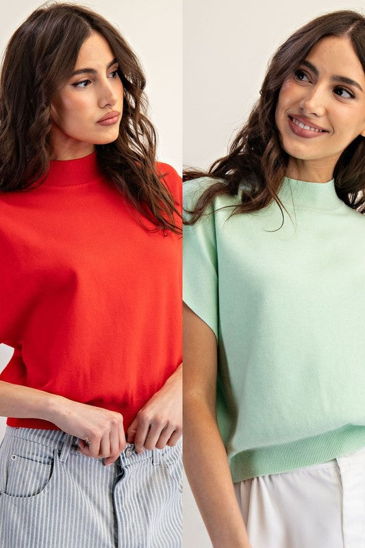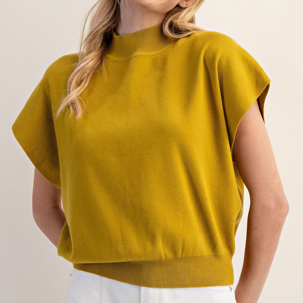 Knit mock neck short sleeve top. Very comfy and easy to pair with any bottoms! Don't miss out on this popular style! Model is 5'9" and wearing a small. Model in oatmeal, bronze, teal, military, pistachio, coco and avocado is 5'8" and wearing a small.