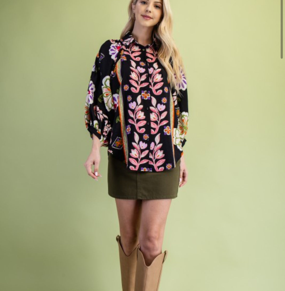 Floral Print Loose Fit Button Down Shirt Model is 5'7" wearing a small.