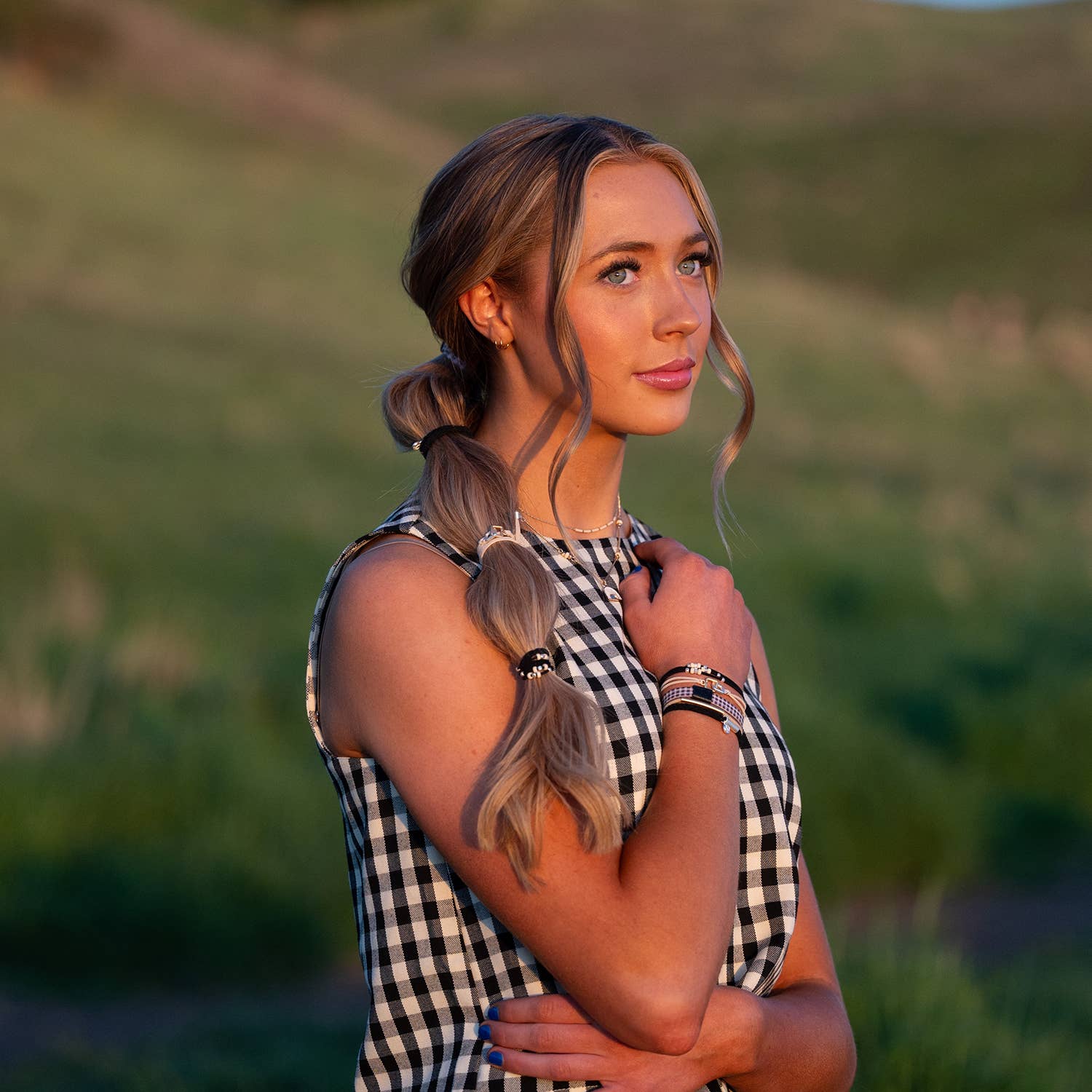 Our Unity set symbolizes connection and strength in togetherness. These 5 hair tie bracelets feature a timeless mix of black and tan tones, accented with silver and cream stone beads. A standout black and cream plaid band adds classic charm, while the gold and silver interlocking square charms represent harmony in diversity. This set is a beautiful reminder that we’re stronger when we stand united.