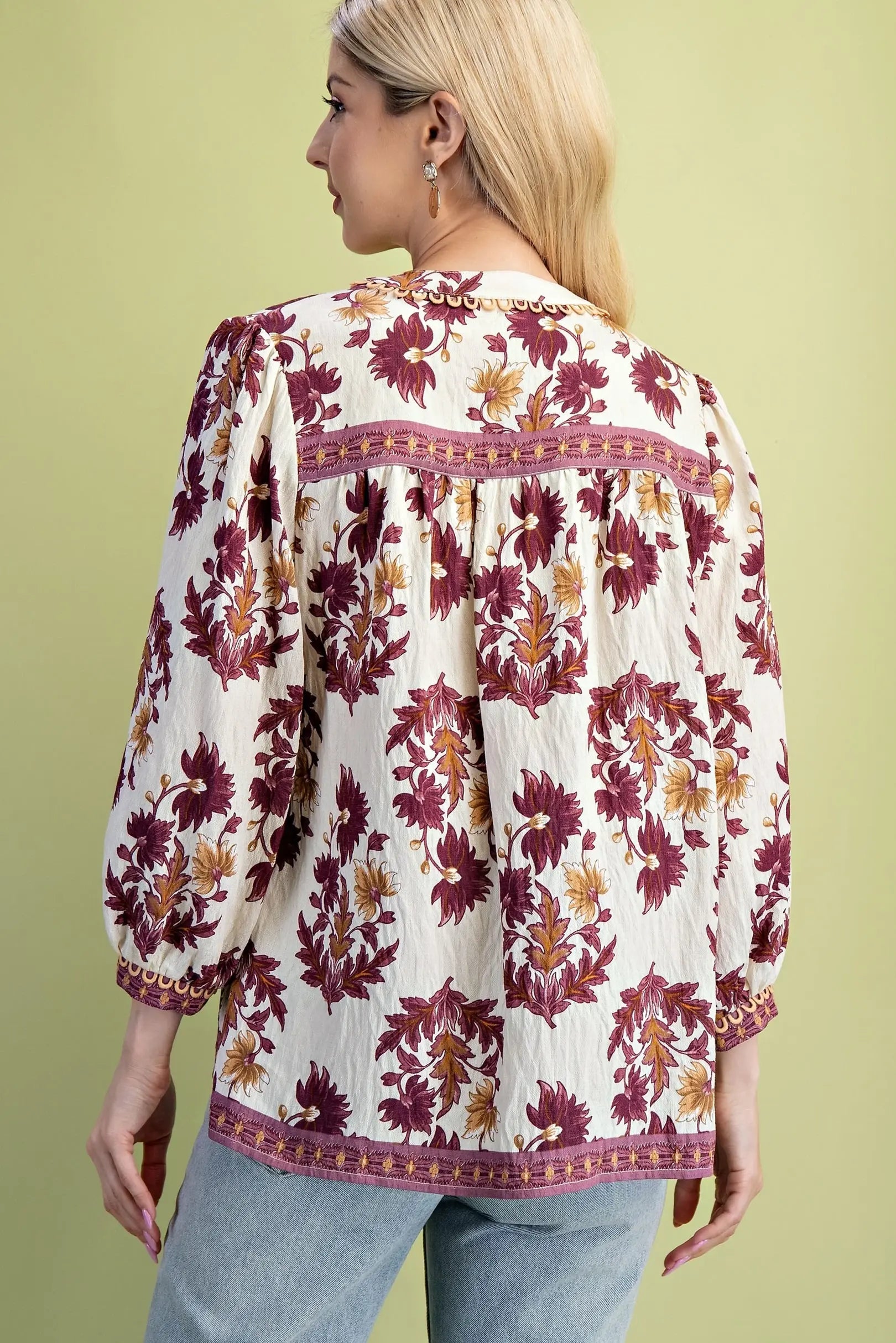Floral Fall Print 3/4 Length Sleeve Blouse with Decorative Trim Details and a Tassel Neck Tie
