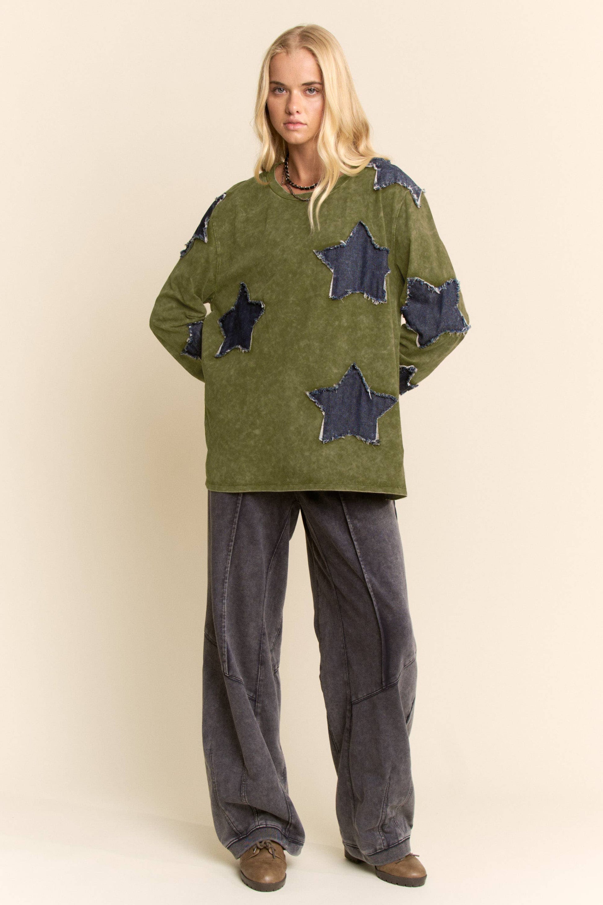 This long sleeve top features bold denim star patches with raw edges set against a washed finish for a relaxed yet standout look. Designed with an easy silhouette that pairs effortlessly with denim or casual bottoms, it adds playful character to boutique collections seeking unique everyday staples.