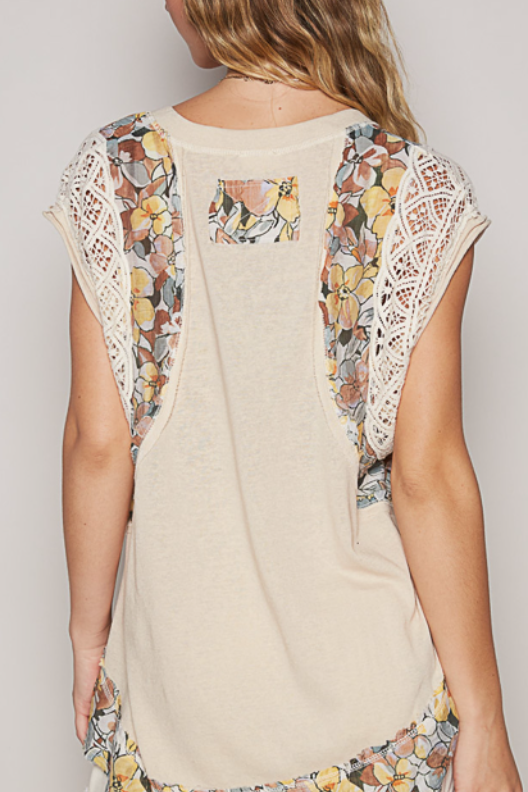 Designed in round neck, sleeveless, relaxed fit top in cotton jersey with lace trim detail pointed floral pattern.